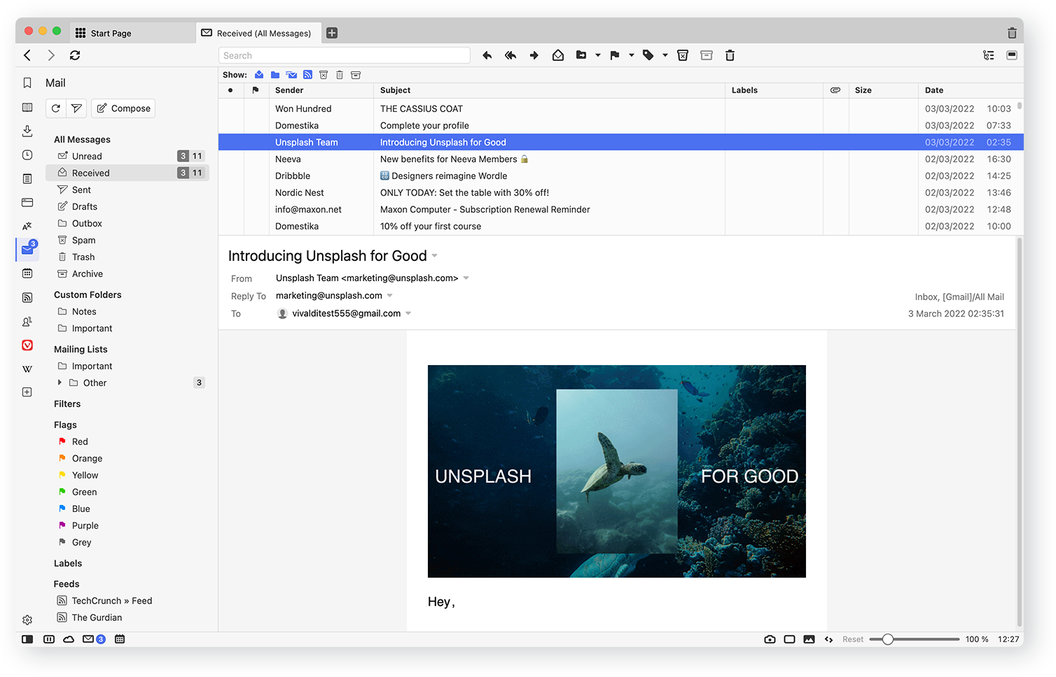 Los nuevos artículos del lector de fuentes de Vivaldi se muestran como el resto de mensajes en la interfaz de correo.