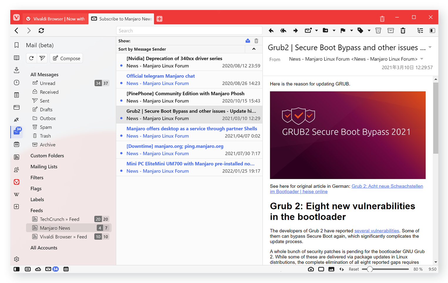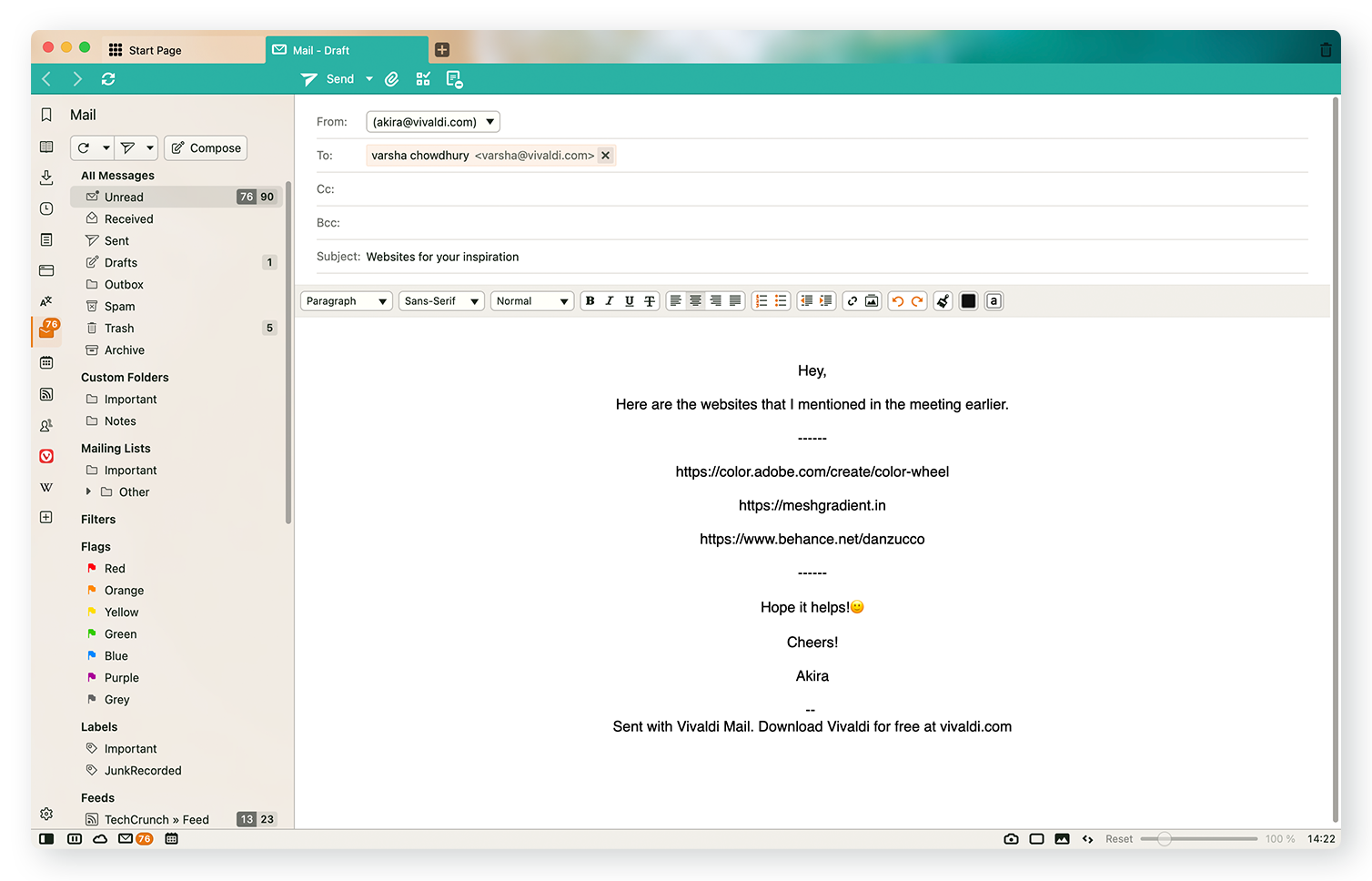 Wbudowany w przeglądarkę klient poczty Vivaldi oferuje niezrównaną funkcjonalność. Ułatwia skupianie się na najważniejszych wiadomościach i zarządzanie wieloma kontami pocztowymi w jednej, łatwej w obsłudze skrzynce odbiorczej.